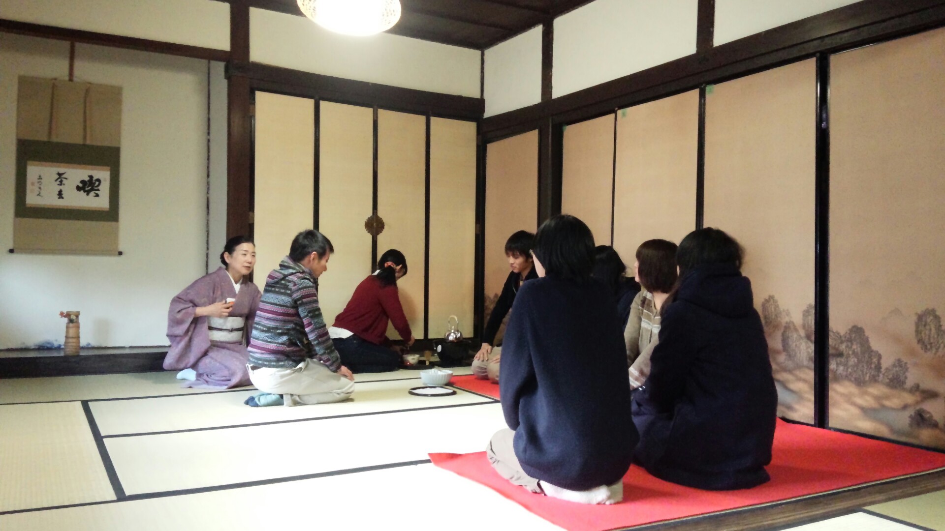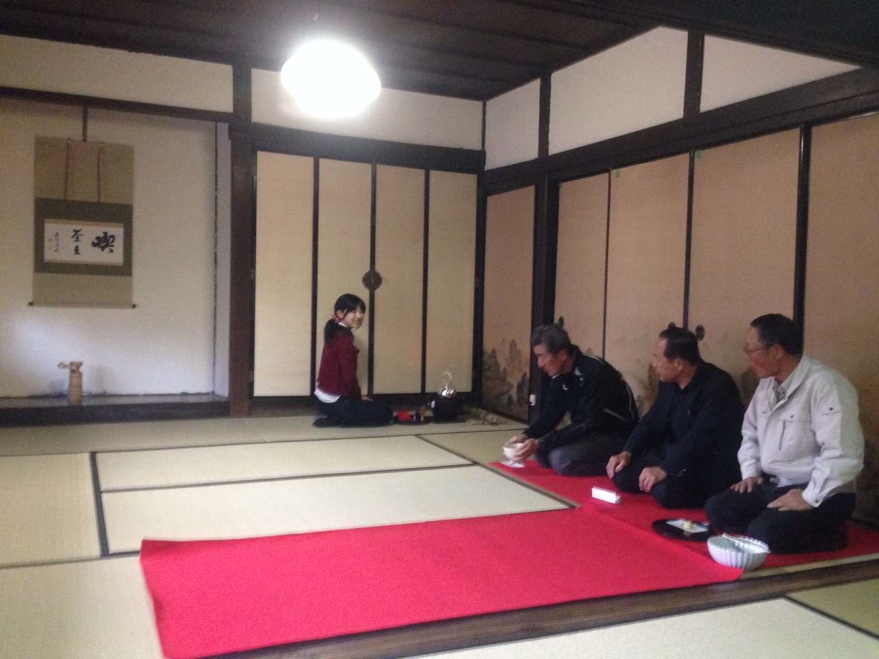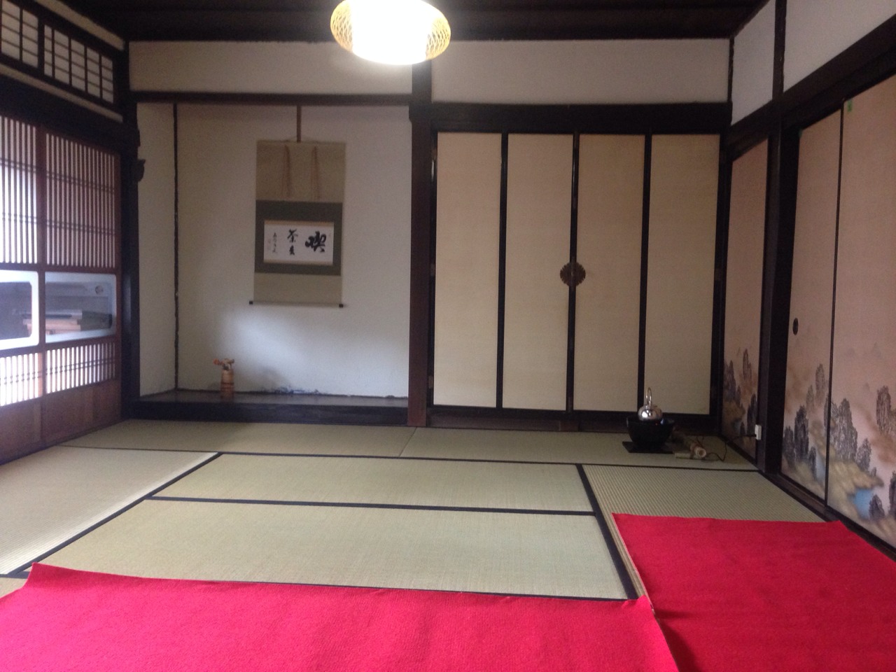掛け軸と、お花と赤い毛氈で、いつもの和室があっという間にお茶室に大変身!!!